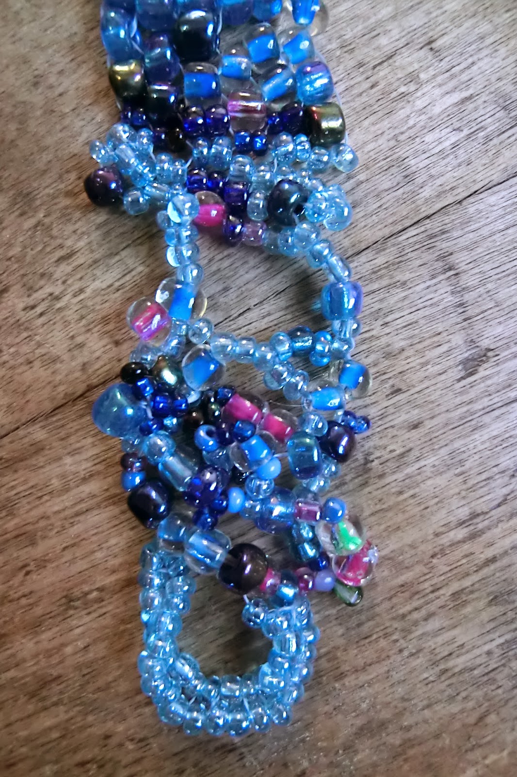 Ik heb lang nagedacht over de sluiting en vond de magnetische sluitingen die ik zag niet mooi, toen heb ik de armband maar in één geheel gemaakt.